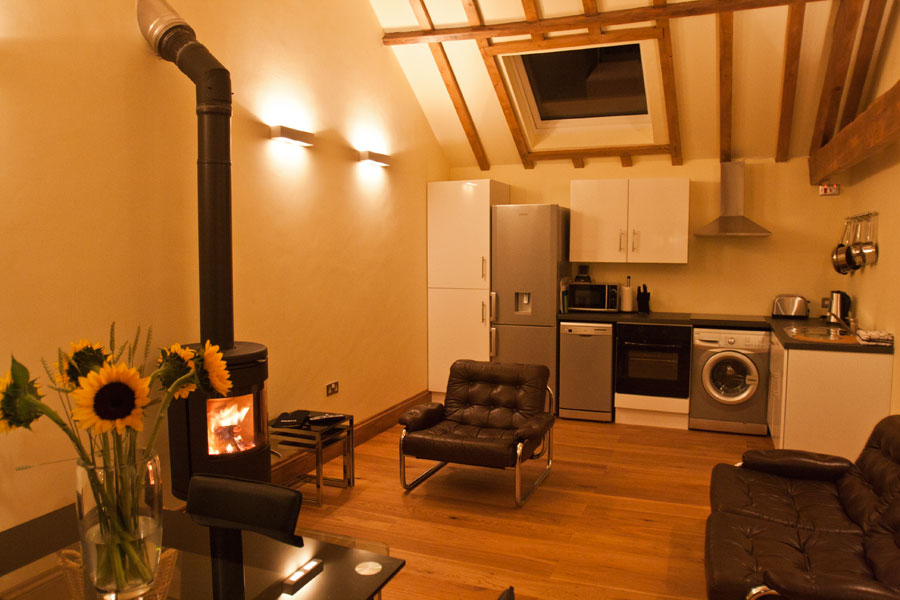 With its vaulted ceiling, solid wooden floors with under floor heating, comfy contemporary furniture, cosy log burning stove and spacious windows opening out onto the outdoor patio area, the lounge is the ideal place to relax whatever the weather.